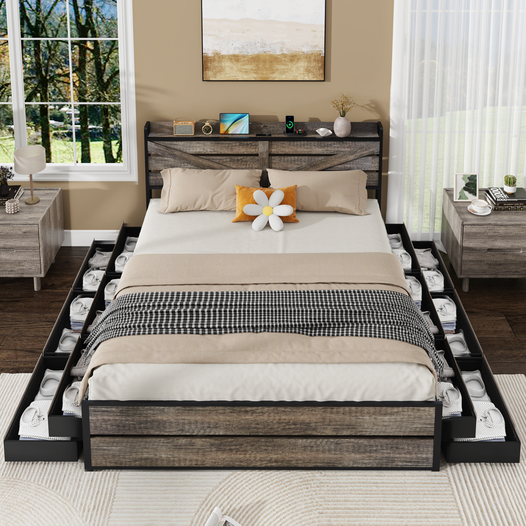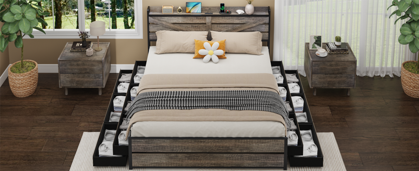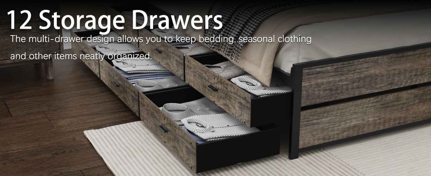 - [12 Storage Drawers] Twelve under bed storage drawers serve as hidden storage spaces, providing you with more storage space and making your bedroom look clean and tidy.