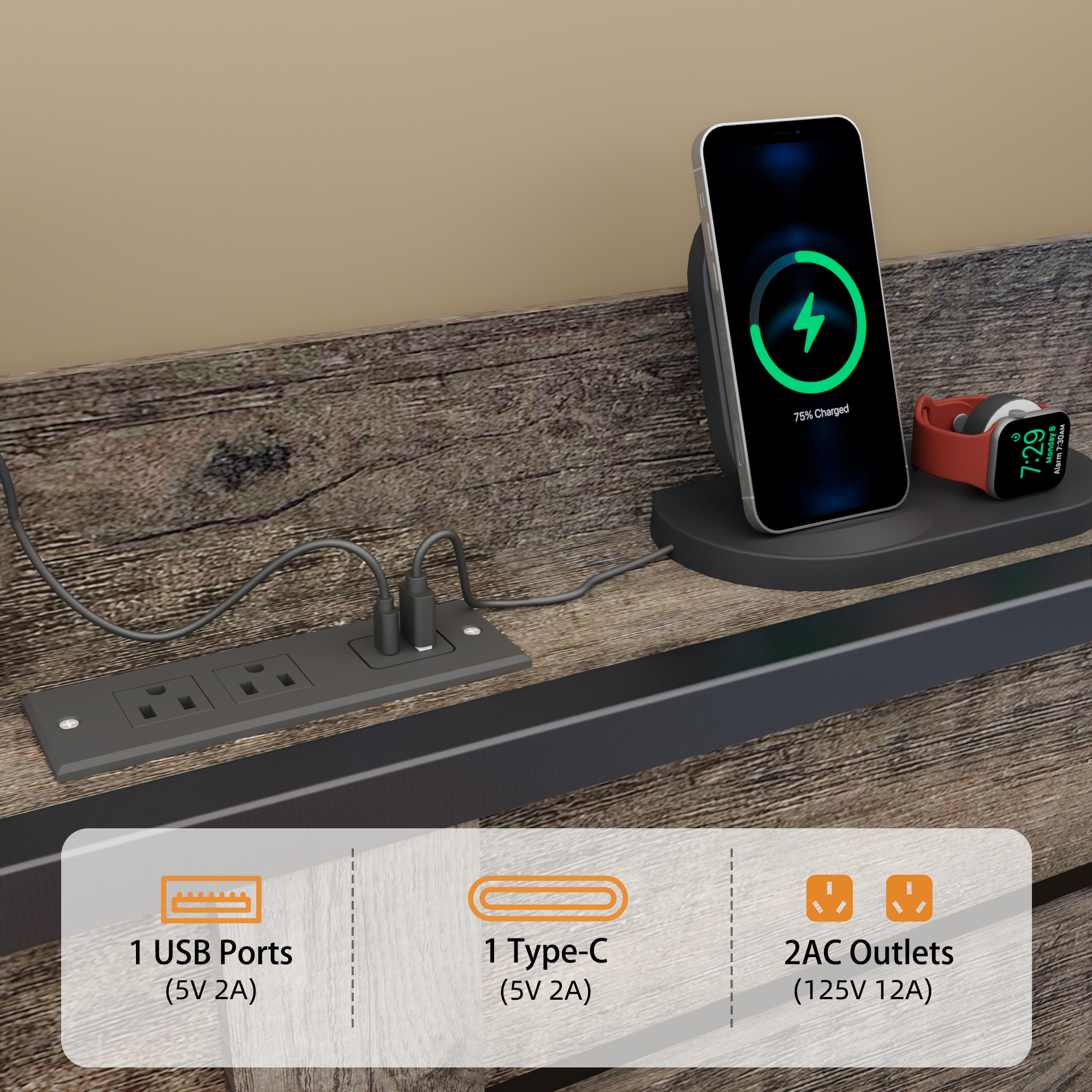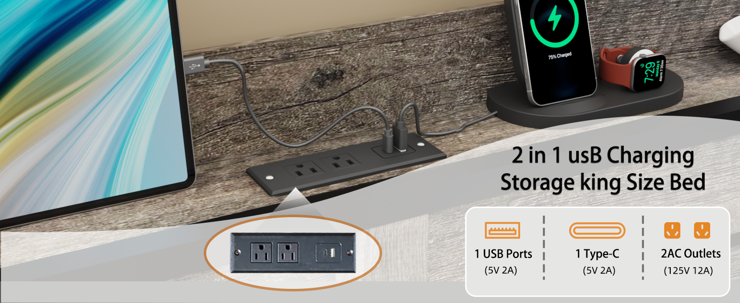 - [Practical Built-in Charging Station] The storage headboard is equipped with a built-in charging station, including 2 AC Outlets, a USB port and a type-C port, allowing you to charge various electronic devices within easy reach.