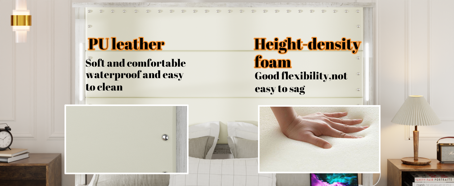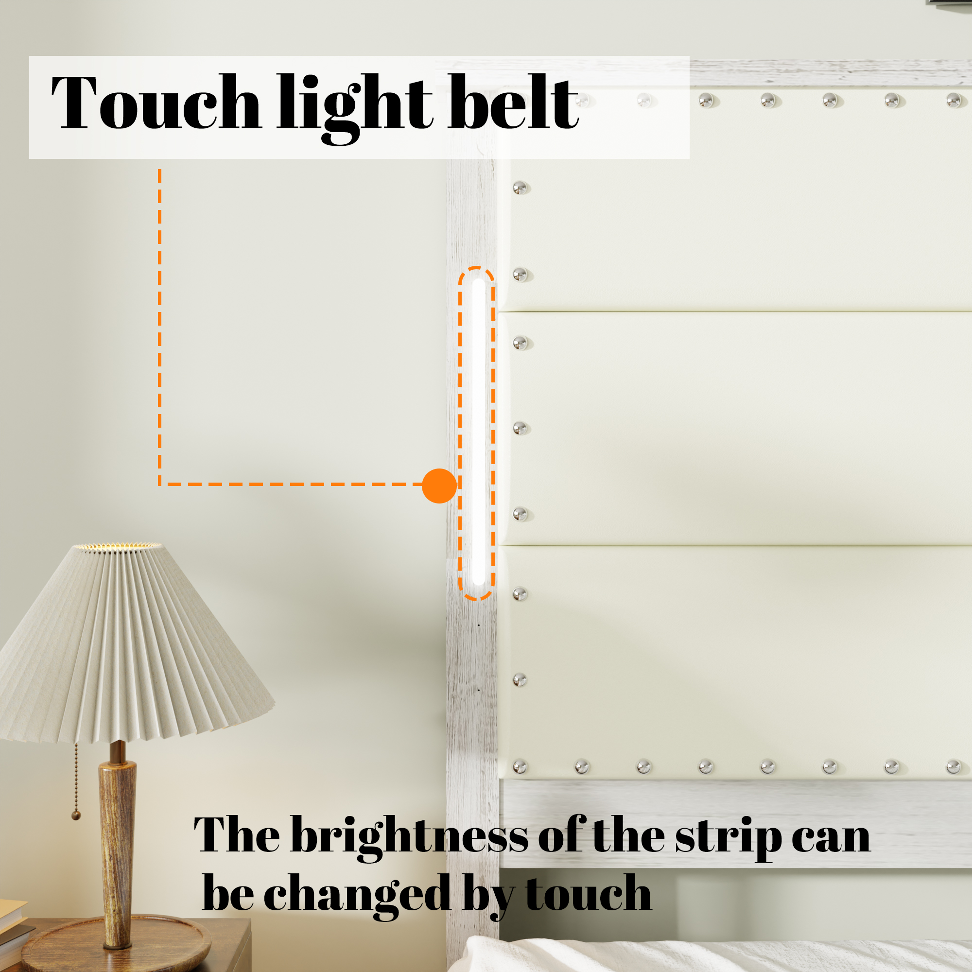 Queen Bed Frame with Charging Station and LED Lights, Wood Slats, Beige Faux Leather & Rivets, No Box Spring Needed