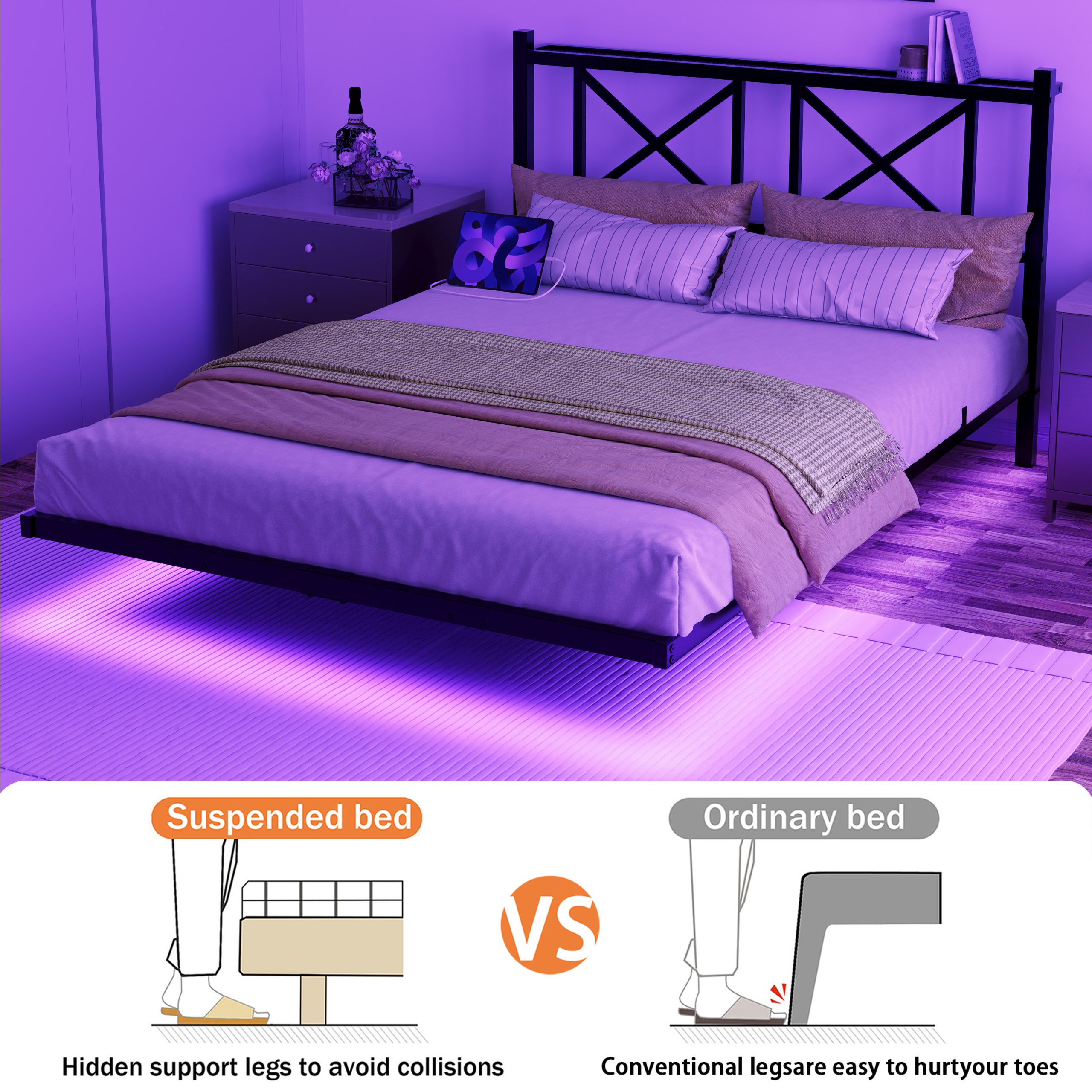 - Magical Floating Design: The floating bed is reinforced with built-in support legs, creating a suspended effect that is balanced and stable while preventing collisions with the feet. The stunning floating effect enhances the atmosphere and modern feel of the bedroom.