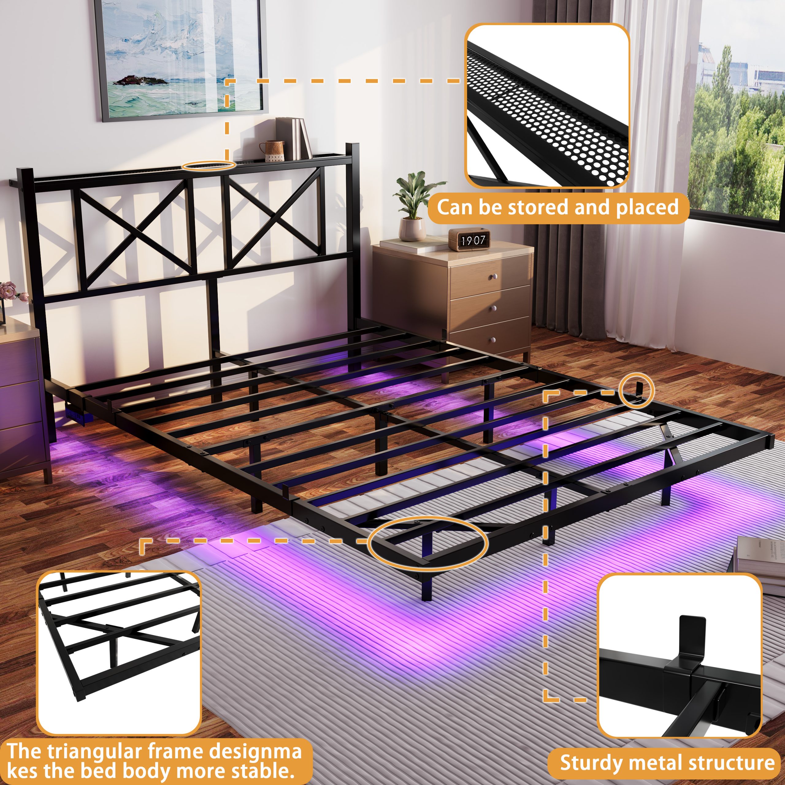 - Smart RGB LED Lights: The full size bed frames comes with RGB LED lights. It can be controlled by button control or mobile app, with more than 2,000 colors of LED lights to choose from. You are free to set custom brightness, color, mode (as style mode, music mode, microphone mode) and timer function settings that best suit your mood. Synchronize the LED lights with music to create a more romantic bedroom atmosphere.