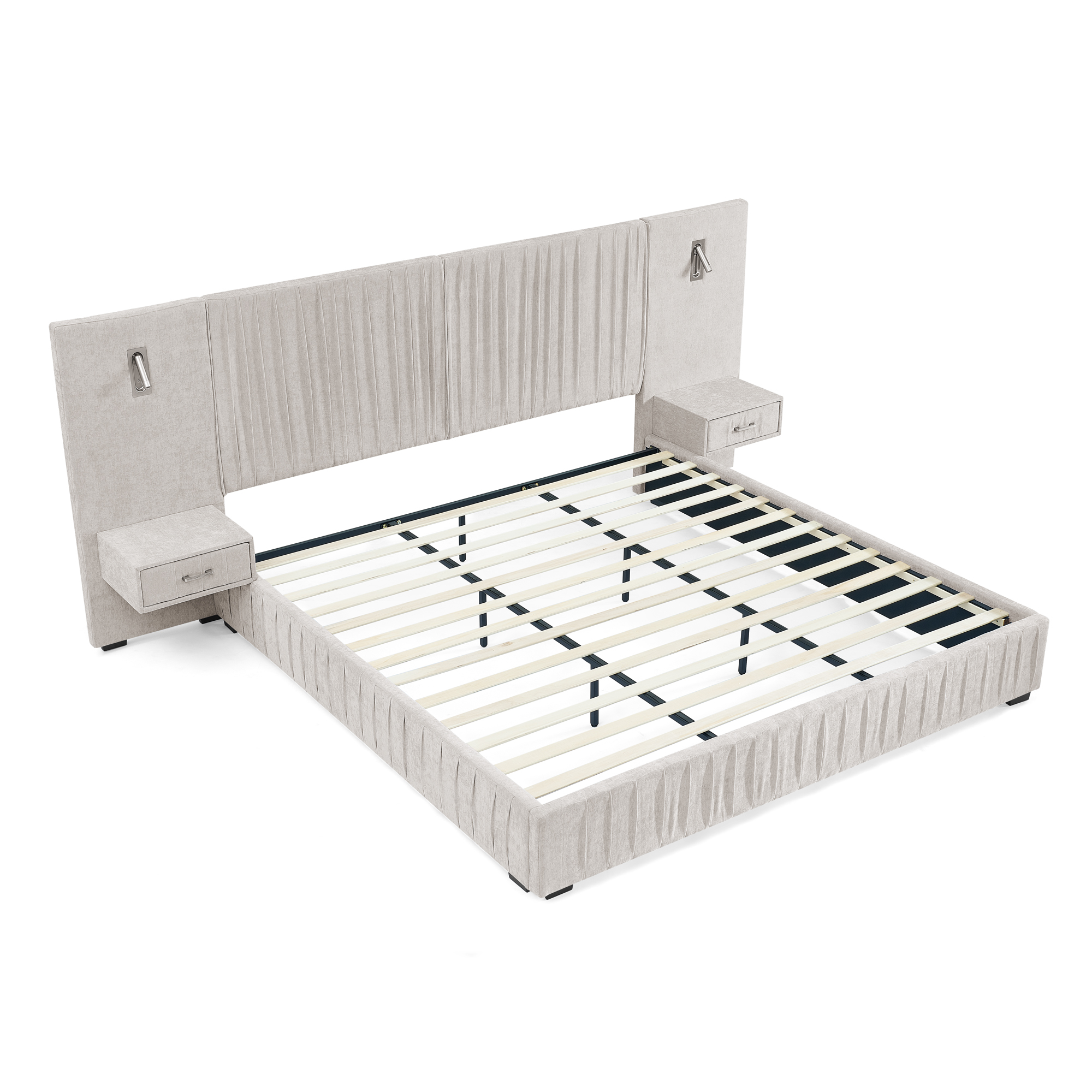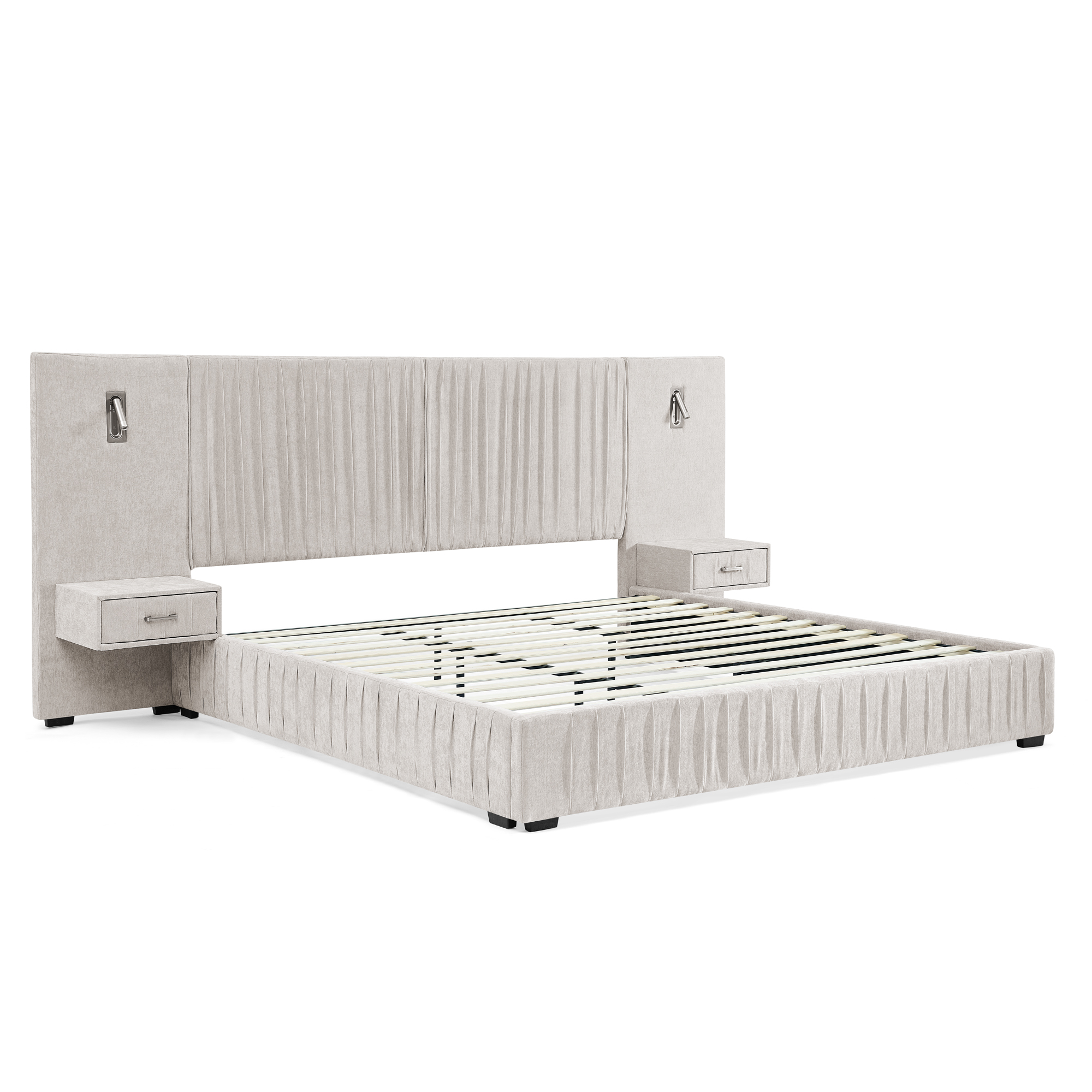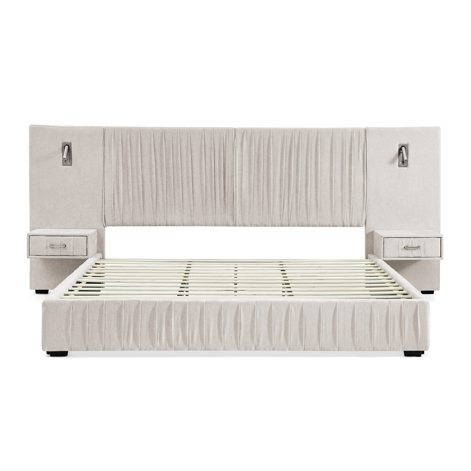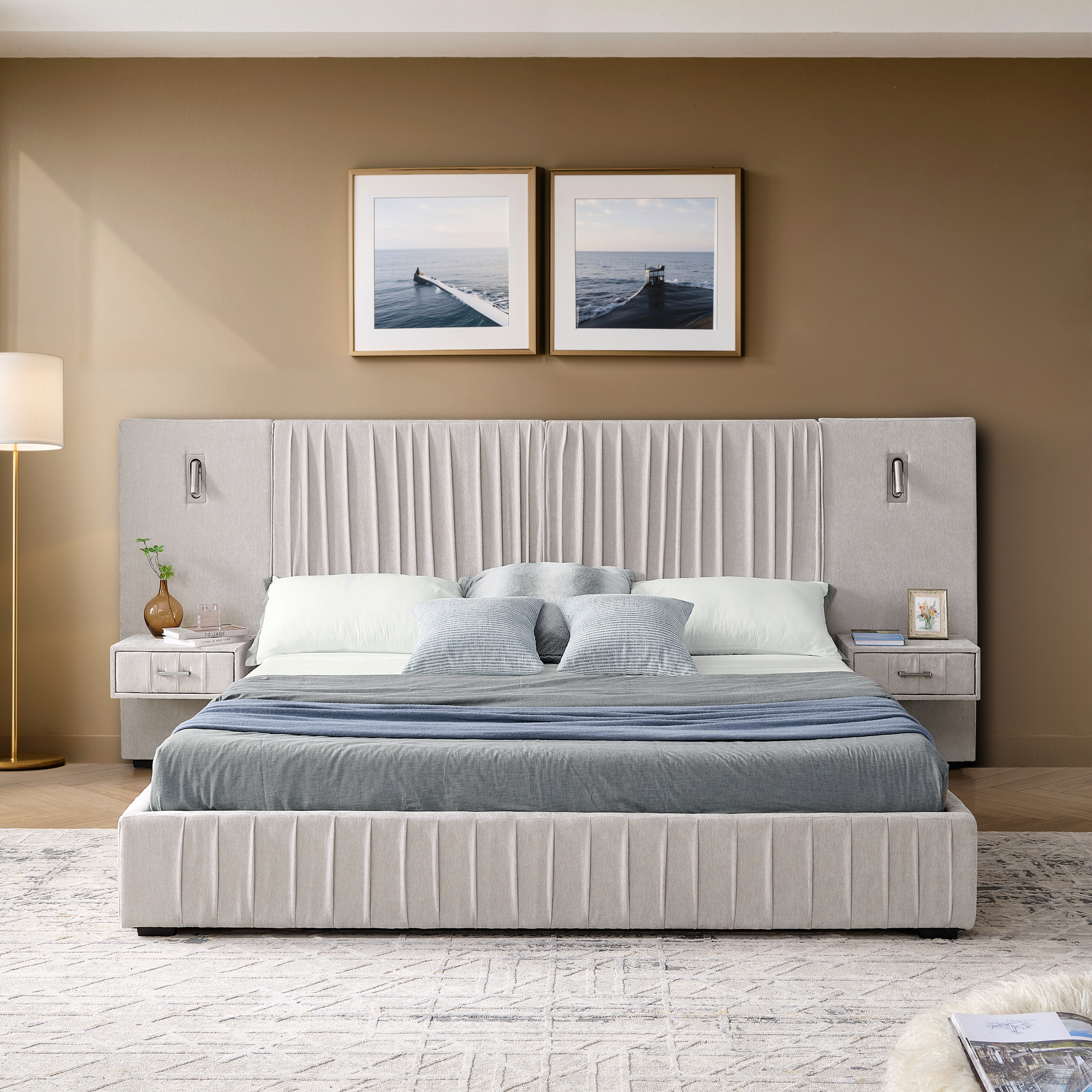 - [Unique Design] -The enlarged and widened headboard not only enhances the visual grandeur but also provides more adequate support for the back when leaning against it, significantly increasing the comfort level. The integrated bedside table design ensures that the style of the bed and the bedside table is unified and the connection is natural, saving bedroom space and creating a unified and minimalist bedroom layout.
