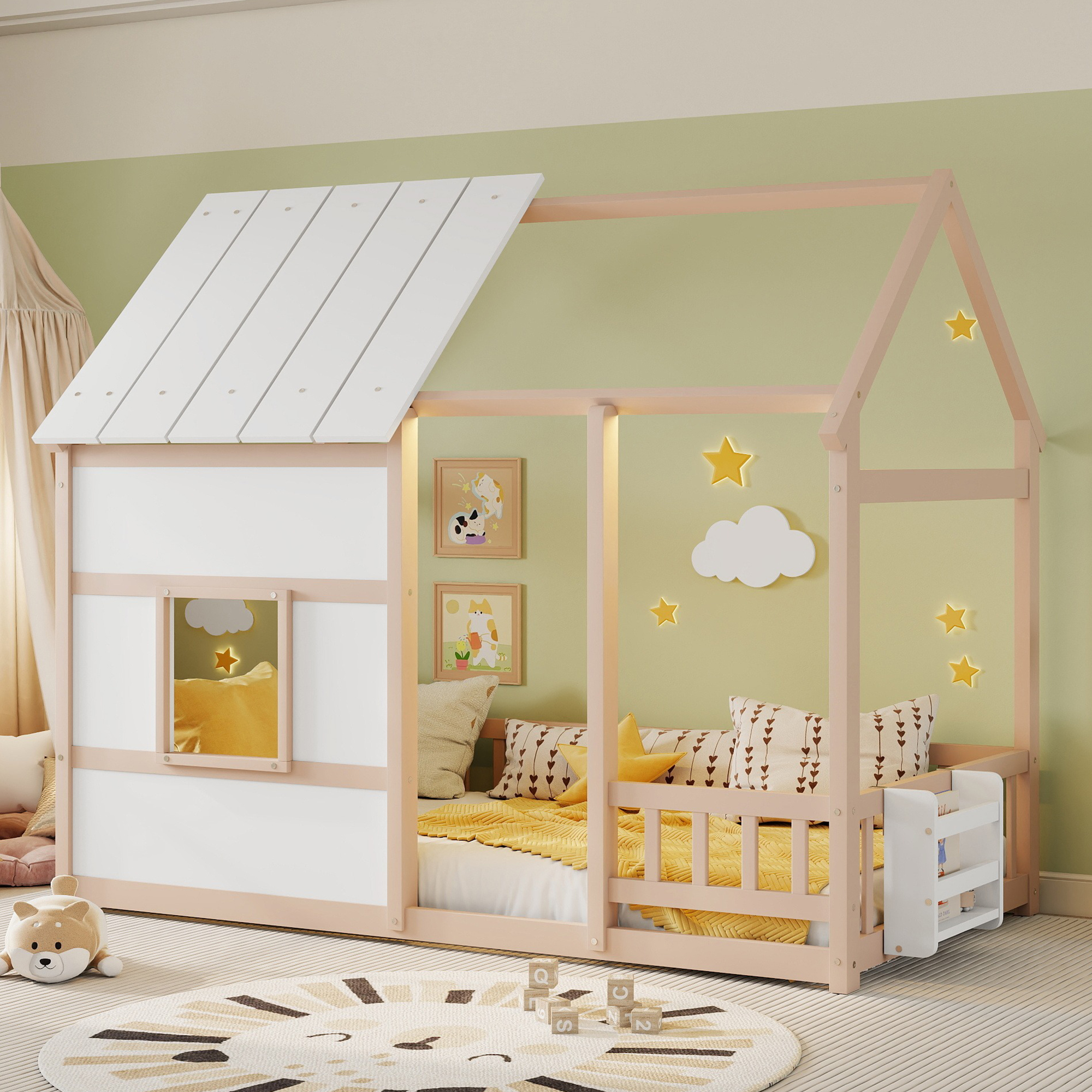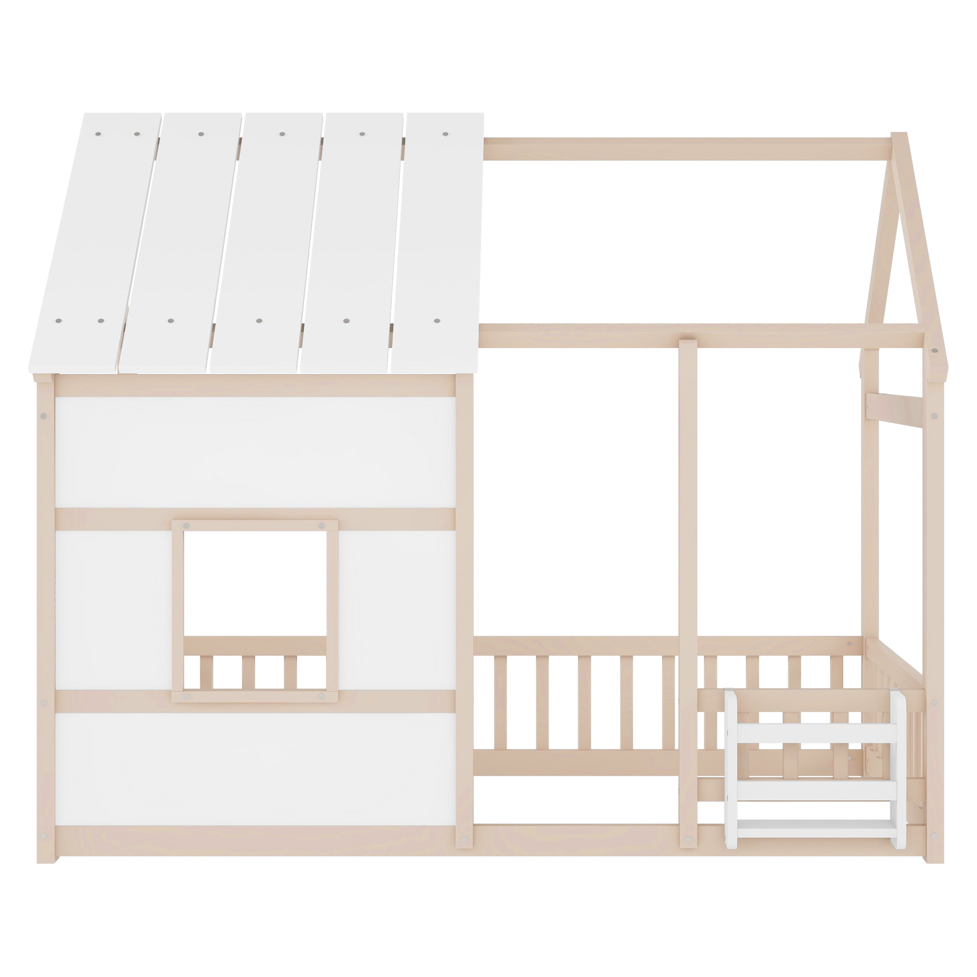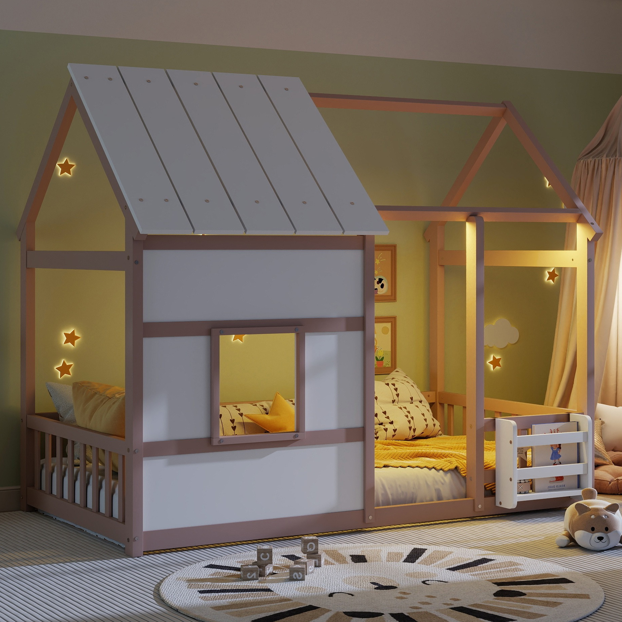 - [House Bed with Roof]: The house-shaped frame and fence simulation game house adds charm and personality to the bedroom, creating an enjoyable and lovely space. It not only serves as a comfortable sleeping area but also doubles as a space for your kids to play and have fun.