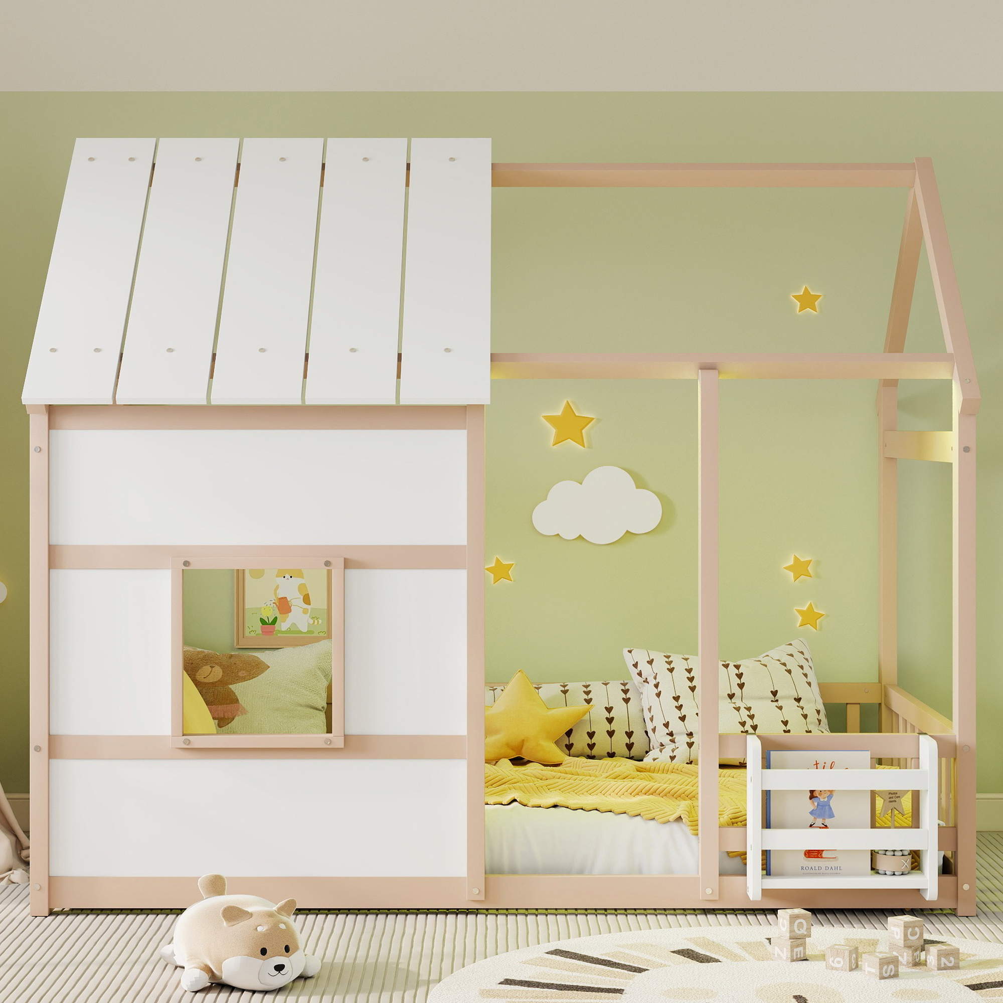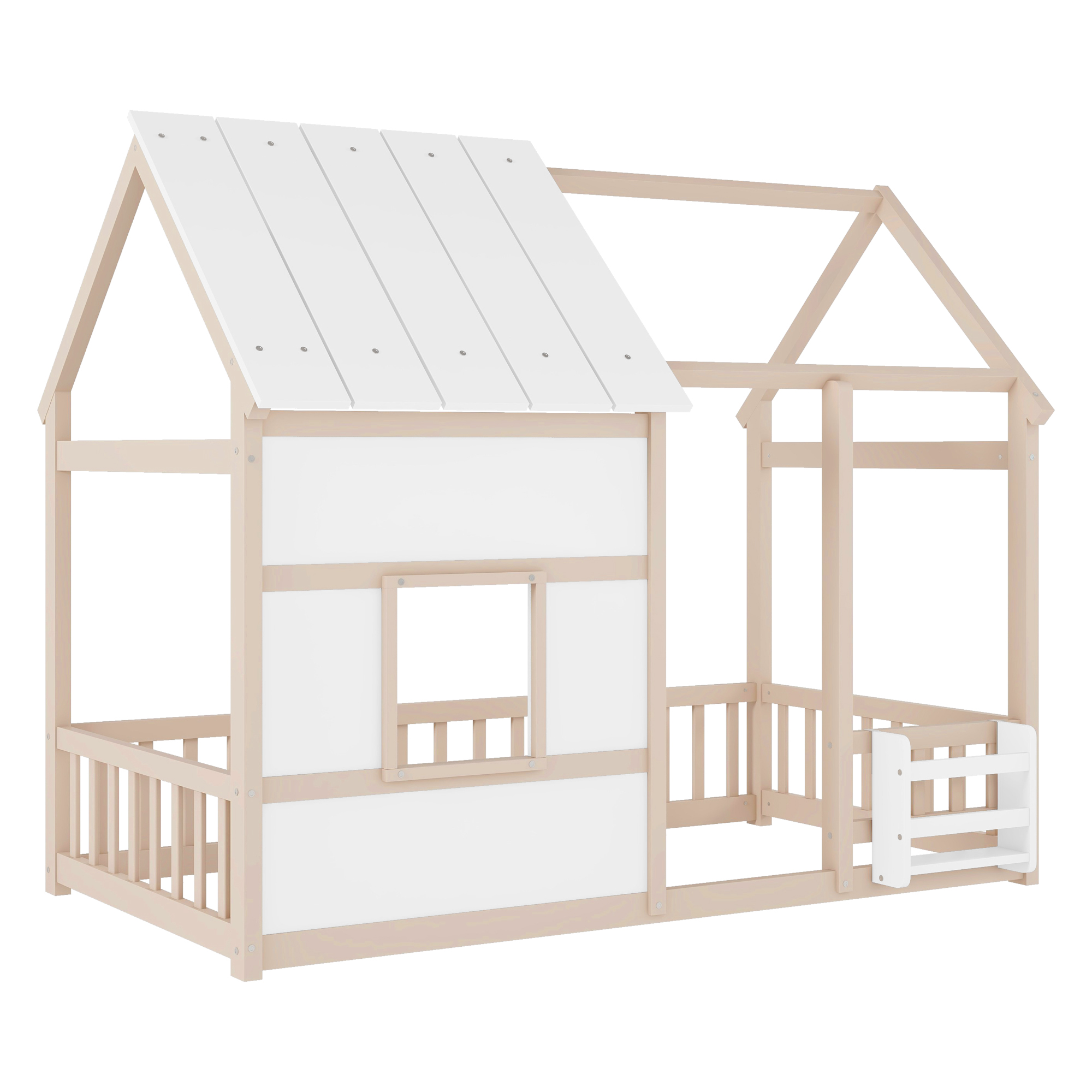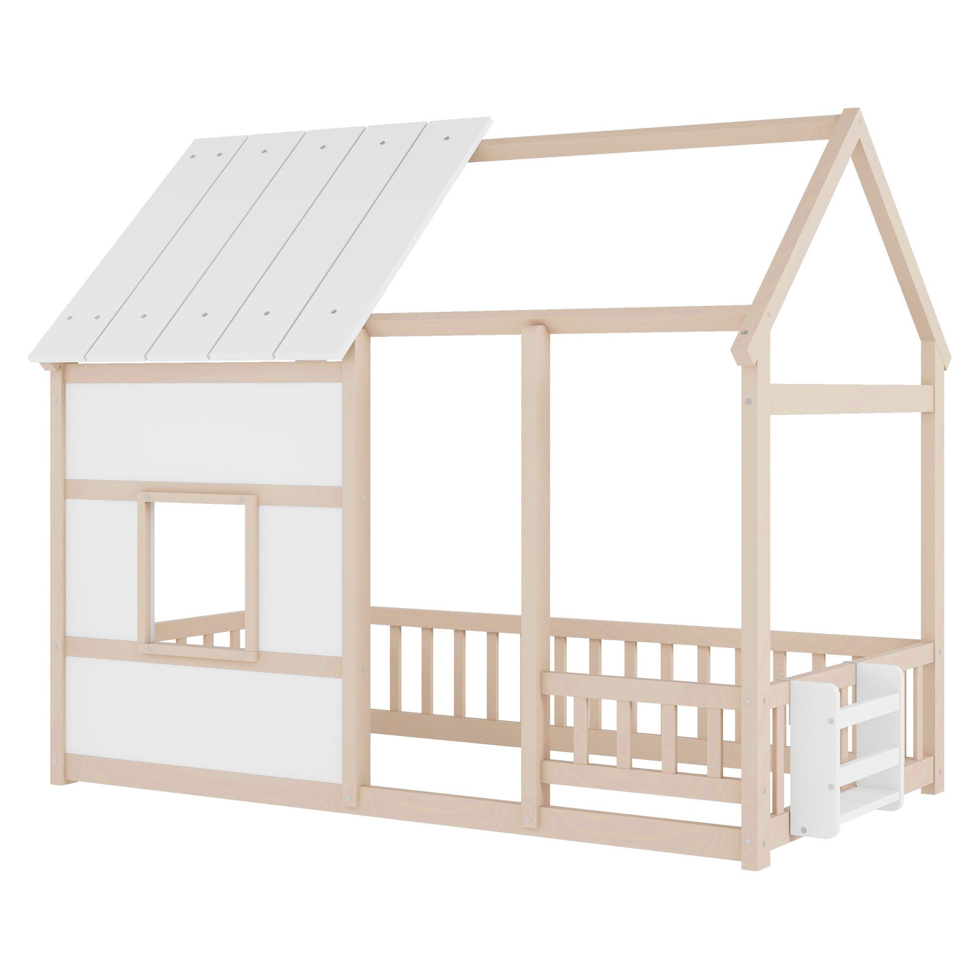 - [House Bed with Roof]: The house-shaped frame and fence simulation game house adds charm and personality to the bedroom, creating an enjoyable and lovely space. It not only serves as a comfortable sleeping area but also doubles as a space for your kids to play and have fun.