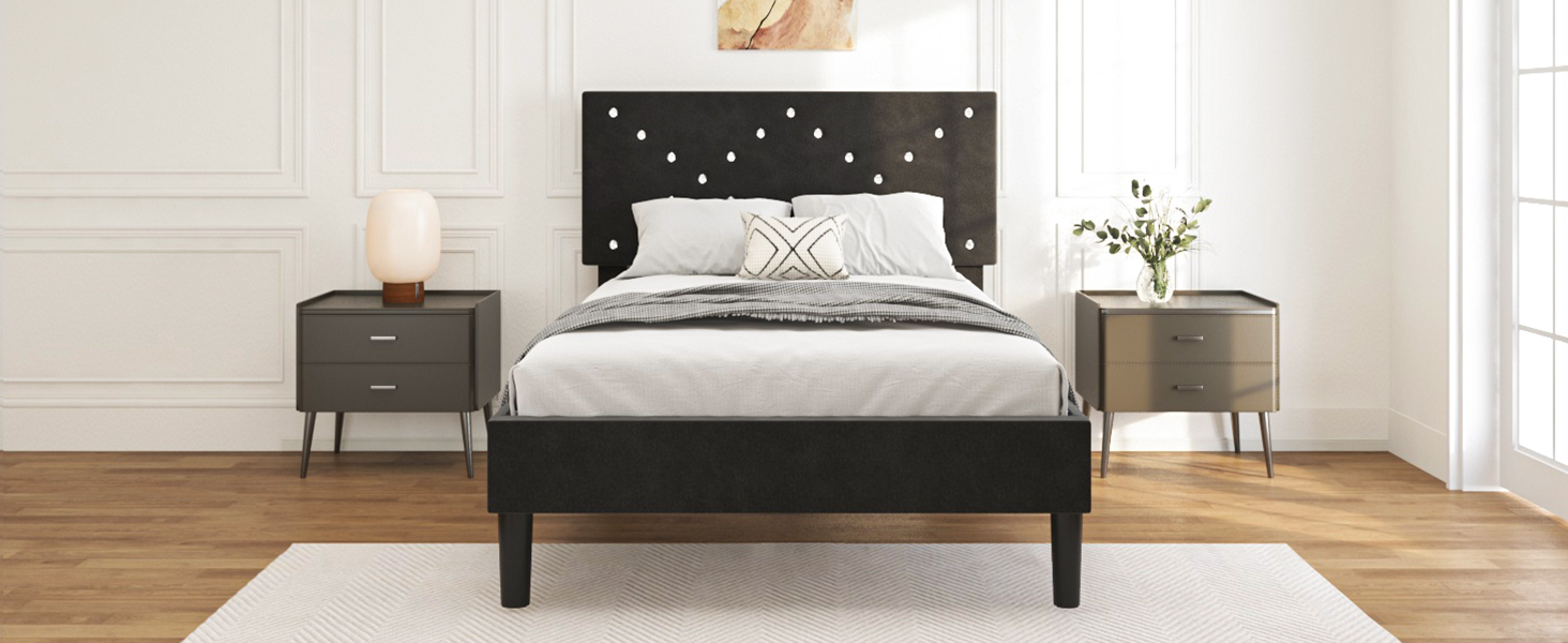 - Minimalist & Noise-Free: This twin-size bed frame features a sleek, padded upholstered headboard that complements a variety of decor styles. Equipped with EVA mute bars, it effectively eliminates friction noise, ensuring a completely silent and creak-free sleeping experience. Perfect for those who value both style and tranquility