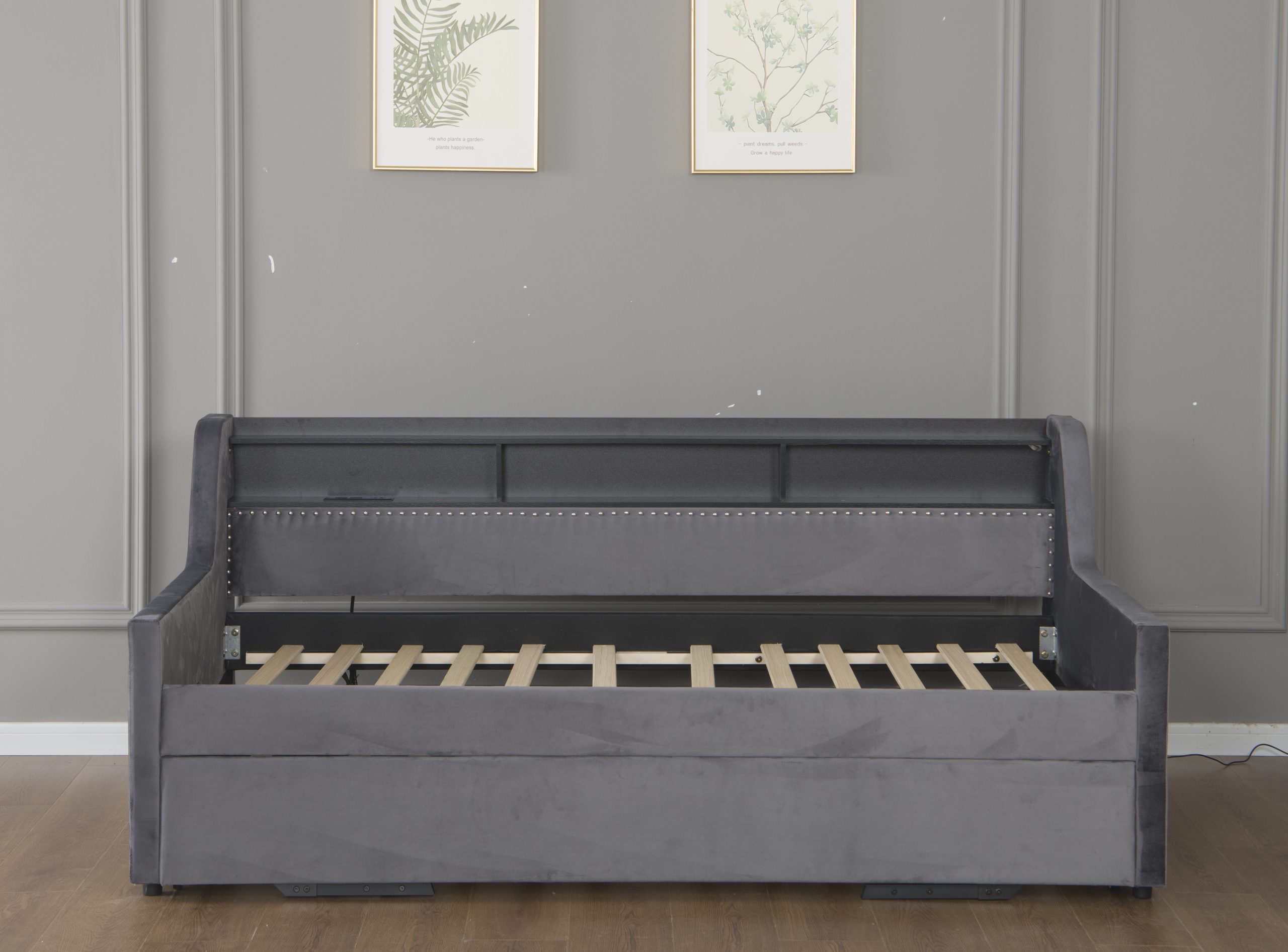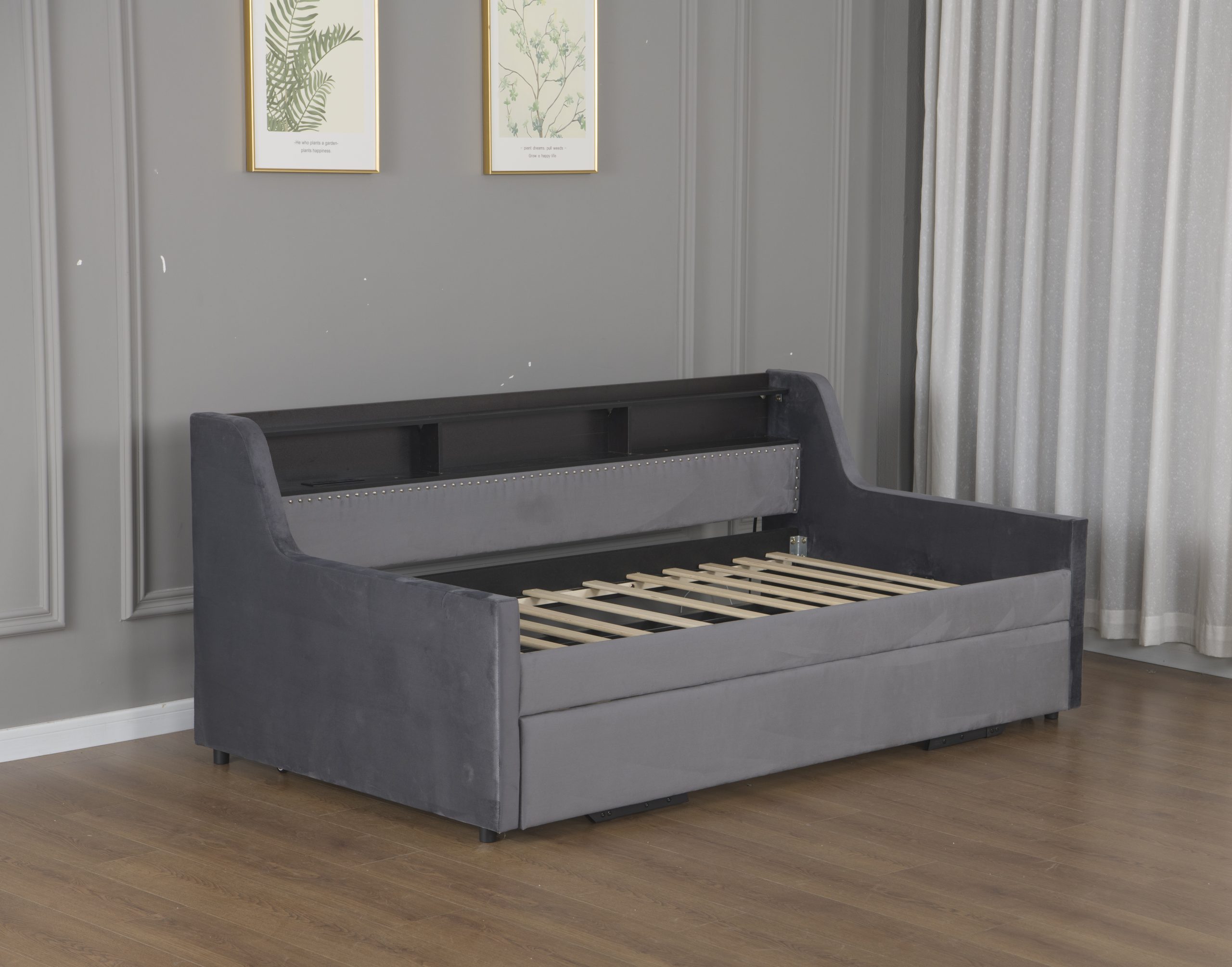 - This corner daybed with trundle is made from high-quality MDF, a sturdy metal frame, and 4 wheels mechanisms.